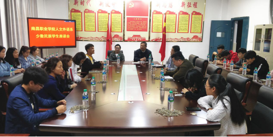 院领导黄恩平出席会议,人文外语系主任于洪颖教授、系党总支副书记史雪飞以及来自藏族、壮族、苗族、回族、满族、白族、彝族、侗族、黎族、土家族、布依族、穿青族等12个不同民族的少数民族学生代表参加本次座谈会。会议由人文外语系副主任王瑞主持。