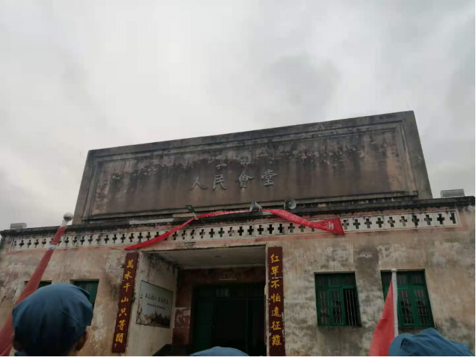 商务英语B2003班周若男同学说:上朔村人民会堂门口有副对联,是毛泽东写下的“红军不怕远征难,万水千山只等闲。”礼堂内保存的毛主席像,历经几十年依旧如新,是上朔人民热爱祖国、忠诚于党的重要象征。从上午八点多到下午一点多,我们路经村庄,田野,湖泊,看到许许多多的鸡、鸭、鹅、大黄狗、在田里耕作的老牛,碰到有村民在赶鸭子,有的在田里农忙,有的在为修建新房干活,虽然中午很晚才吃饭,我们又饿又累又困,但正是这样,更让我们能够想象到当年红军长征时的辛苦与劳累,况且我们只是走了一部分,挎了一个装水的包,而当年长征的红军则携带沉重的武器、弹药、给养。可想而知,红军长征多么不易,而他们又有多么坚强的毅力啊!