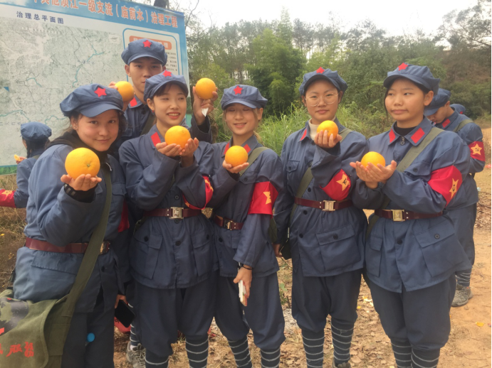 商务英语B2002班彭丹丹同学说:为了深入体验红军长征精神,今天上午我们开始了十五公里的徒步行走。十五公里表面看来是一个简单的数字,但真正行走起来确是让人吃力的。可想而知红军将士们在当时艰苦的条件下是如何走完这二万五长征路的。在经过赣粤交界处时,以故乡水为界,一边是坎坷崎岖的乡间小路,一边是连绵高耸的巍峨大山,即便如此,它没有隔开赣粤两省人民的心,看到瑶族、苗族等少数民族村落,使我真切地感觉到无论何时中国永远是一个整体,56个民族永远是兄弟姐妹,共襄中华之盛世。