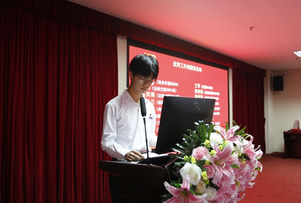 会议第六项为校绩效考核管理办公室、督查督办办公室副主任邹俊强同志宣读表彰2021—2022学年人文学院各项比赛获奖个人、集体和院各项活动优秀工作者名单,并为获奖代表颁奖,各项比赛先进工作者代表余骏驰同学发言。